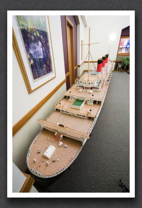 Length: 25 feet 3 inches This was the largest ship I have ever built, and will probably remain the largest ship I have ever built. It took too long, too much to move around and had a hard time convincing museum to to exhibit it. Built in 6 sections, the Queen Mary was never assembled full until it's first exhibit. There were 3 lower hull pieces and 3 upper works sections. I had doubts that it would be accurate enough to look good. Yet, on it's first exhibit, it looked perfect. This ship has been seen internationally and many many online blogs feature photos of it. It featured on Good Morning America, and ABC Word News. Most of all, this was the first ship that I used the internet for photos and mechanical drawings. My previous were chosen because I could only find that kind of detail with more notable ships that had sunk. |