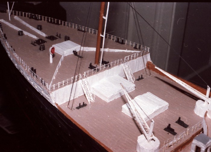 Length: 10 feet Beam 18 inches The RMS Titanic was the first ocean liner I had ever built. It was inspired by the first search of the Titanic by Grimm in the early 80s. And, of course, the book "A Night to Remember" by Walter Lord. The ship was built from deckplans from Lord's book. There was no internet back then. So, if I could not find it in the local library, my ship was sunk. This ships was built with a 3 section skeleton. They would be jointed together for a total length of 10 feet. Though there were many mistakes in the construction process, I learned a lot how to make a toothpick infrastructure, similar to how bridges are constructed. Ultimately, I would be able to make them bigger, better and more detailed. |