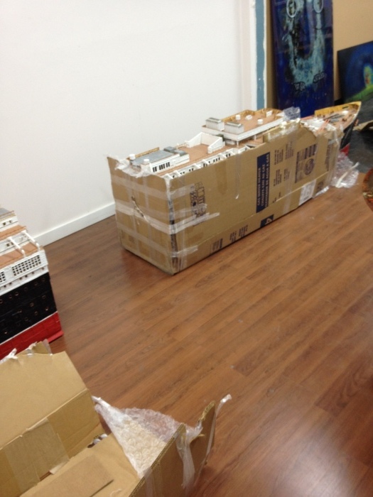 Not exactly the easiest of hobbies to manage and mantain. But, I like to do it anyway For a whole year, starting in March of 2015, I worked on the SS America non-stopped. I limited my entertainment excursions, ate dinner in my car on my way home from work. All to save time. I was just that determined to get this thing done and out of my house. It was starting to be like an uninvited guest. At left, are all my facebook updates that I posted starting from present going to back to March 2015. During that whole year, I added over 140,000 toothpicks to the upper sections of the ship. My original estimate was 3 months to completion. I was about 9 months late. It is a real toothpick timeline! |