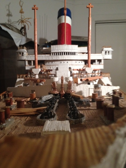 Not exactly the easiest of hobbies to manage and mantain. But, I like to do it anyway For a whole year, starting in March of 2015, I worked on the SS America non-stopped. I limited my entertainment excursions, ate dinner in my car on my way home from work. All to save time. I was just that determined to get this thing done and out of my house. It was starting to be like an uninvited guest. At left, are all my facebook updates that I posted starting from present going to back to March 2015. During that whole year, I added over 140,000 toothpicks to the upper sections of the ship. My original estimate was 3 months to completion. I was about 9 months late. It is a real toothpick timeline! |