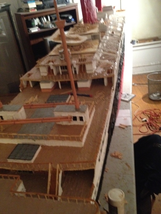 Not exactly the easiest of hobbies to manage and mantain. But, I like to do it anyway For a whole year, starting in March of 2015, I worked on the SS America non-stopped. I limited my entertainment excursions, ate dinner in my car on my way home from work. All to save time. I was just that determined to get this thing done and out of my house. It was starting to be like an uninvited guest. At left, are all my facebook updates that I posted starting from present going to back to March 2015. During that whole year, I added over 140,000 toothpicks to the upper sections of the ship. My original estimate was 3 months to completion. I was about 9 months late. It is a real toothpick timeline! |